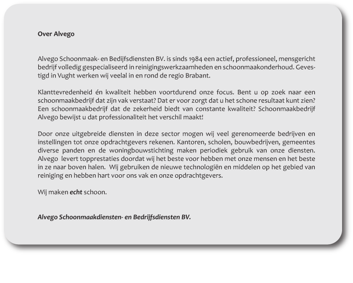Alvego Schoonmaak- en Bedijfsdiensten BV. is sinds 1984 een actief, professioneel, mensgericht bedrijf volledig gespecialiseerd in reinigingswerkzaamheden en schoonmaakonderhoud. Gevestigd in Vught werken wij veelal in en rond de regio Brabant.
